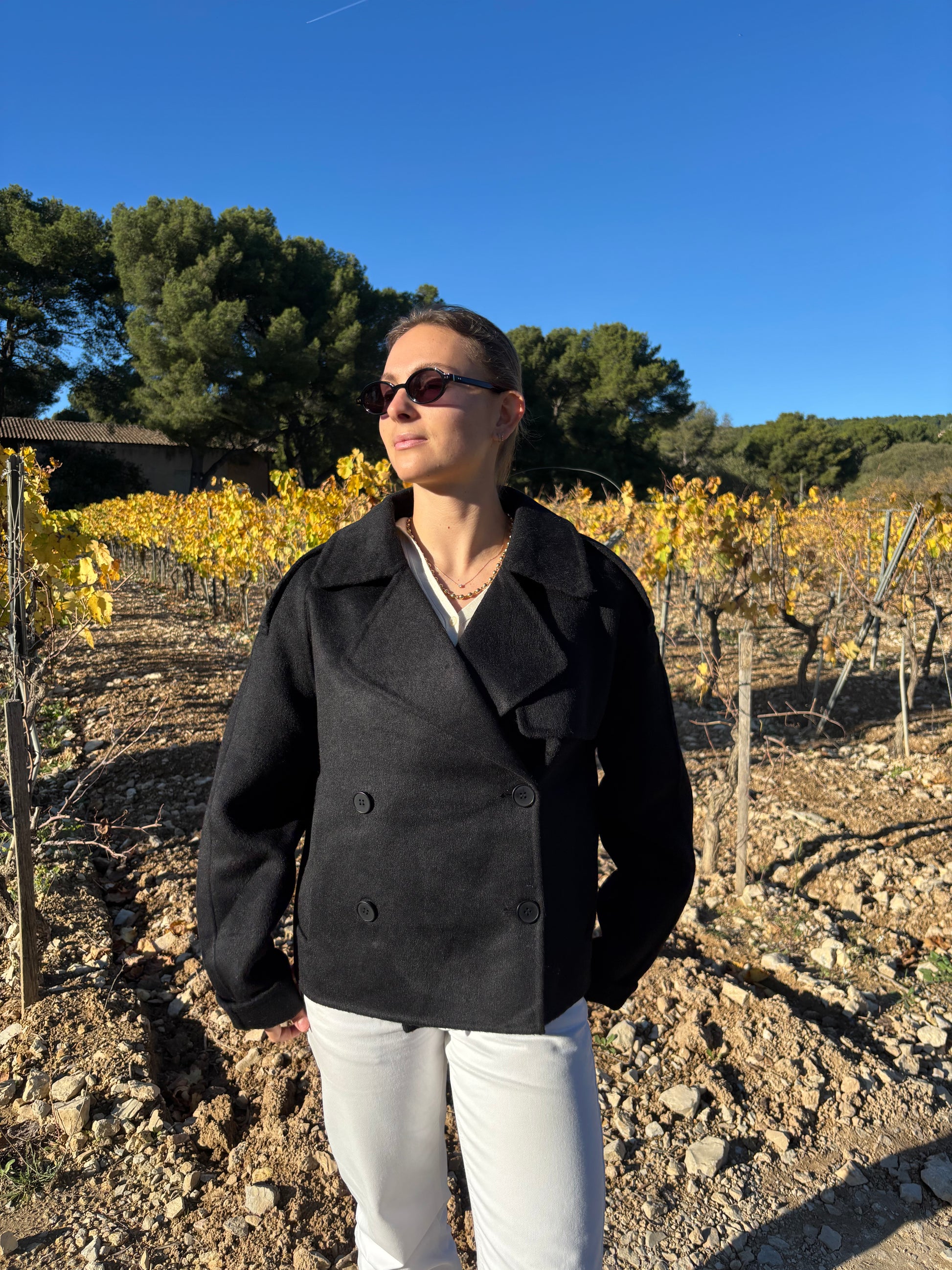 Élégante et intemporelle, cette veste chic allie style classique et modernité. Confectionnée dans un lainage noir de qualité, elle se distingue par sa coupe structurée et sa longueur fusion qui s'arrête à la taille.