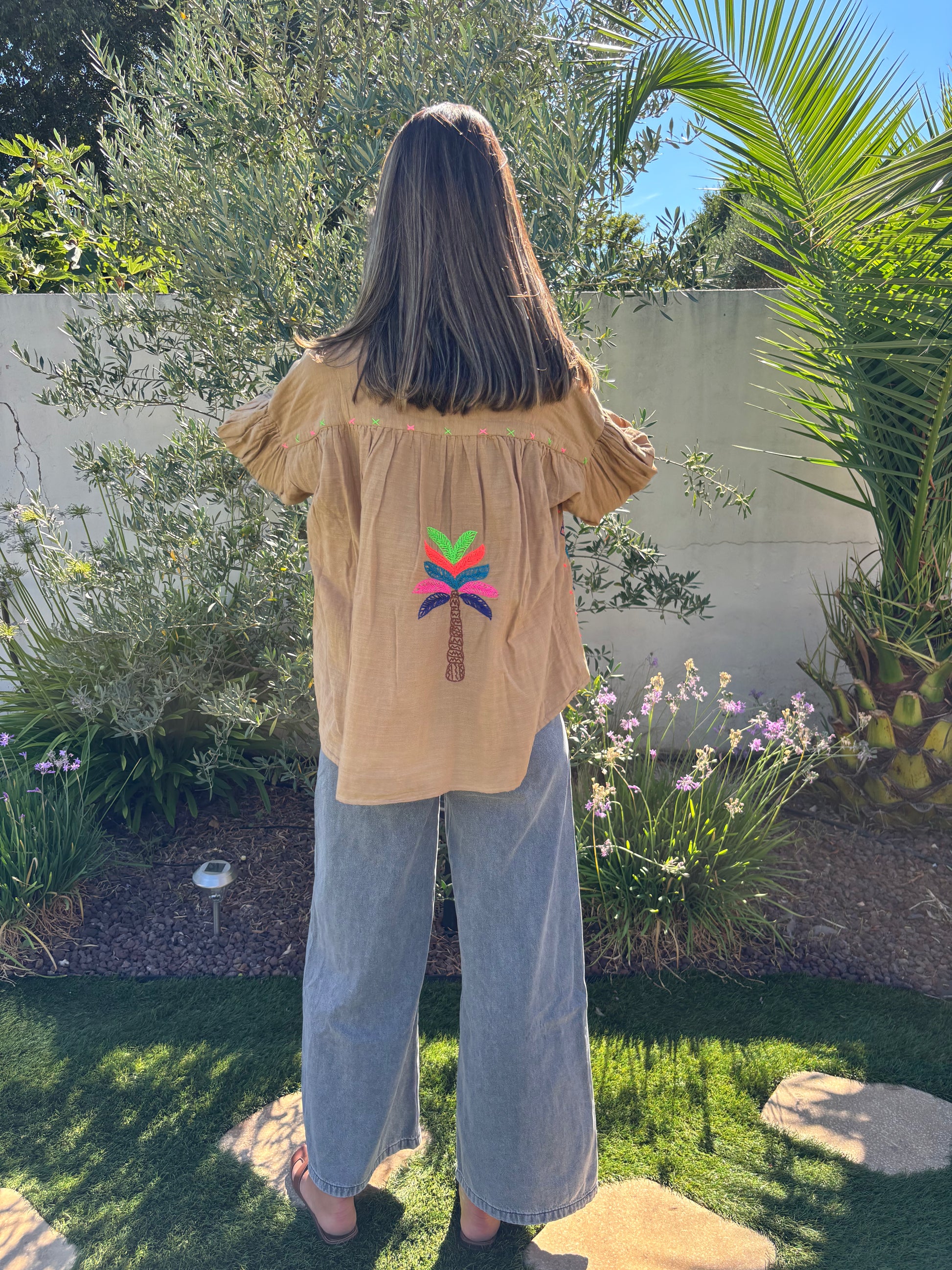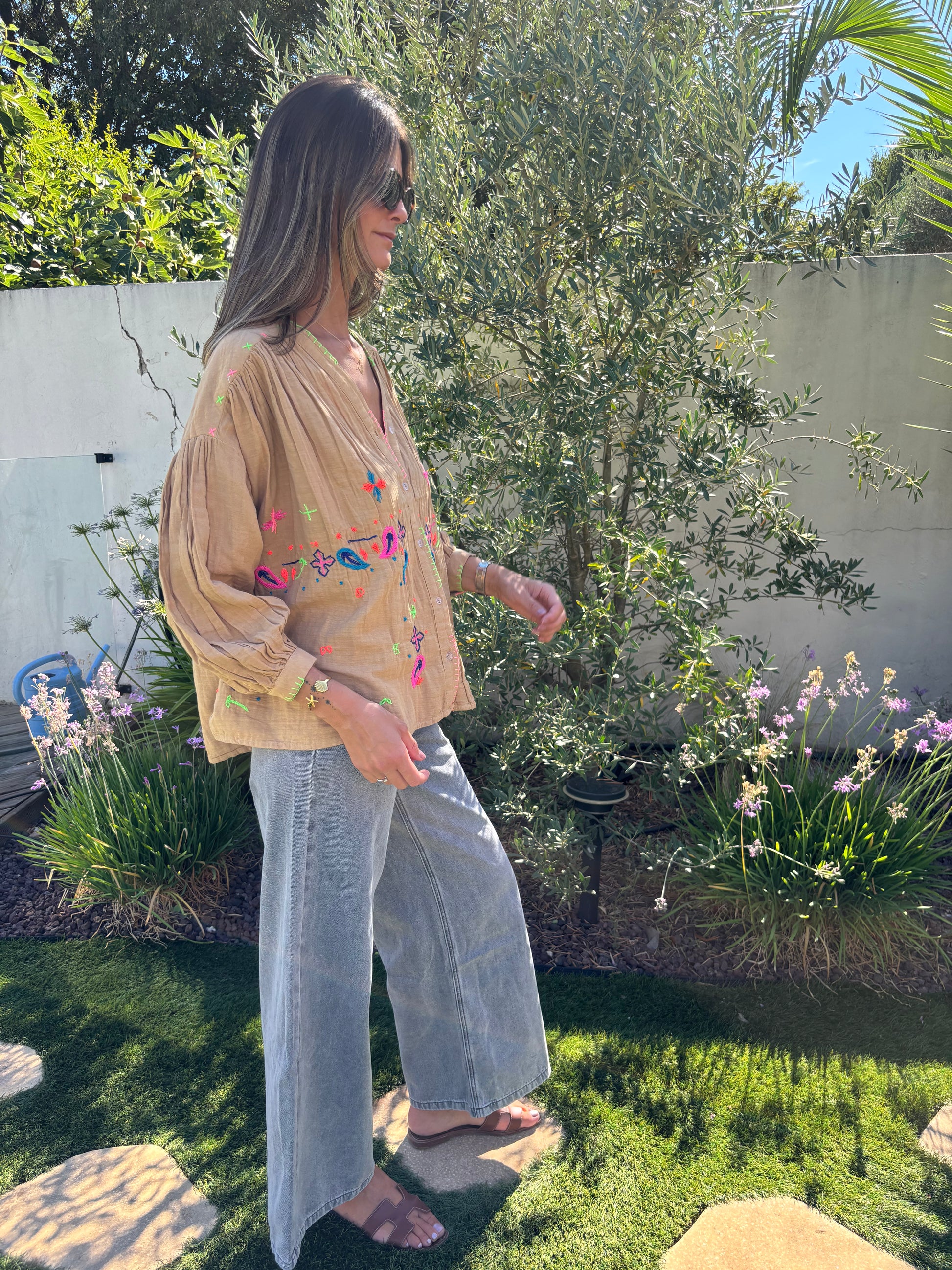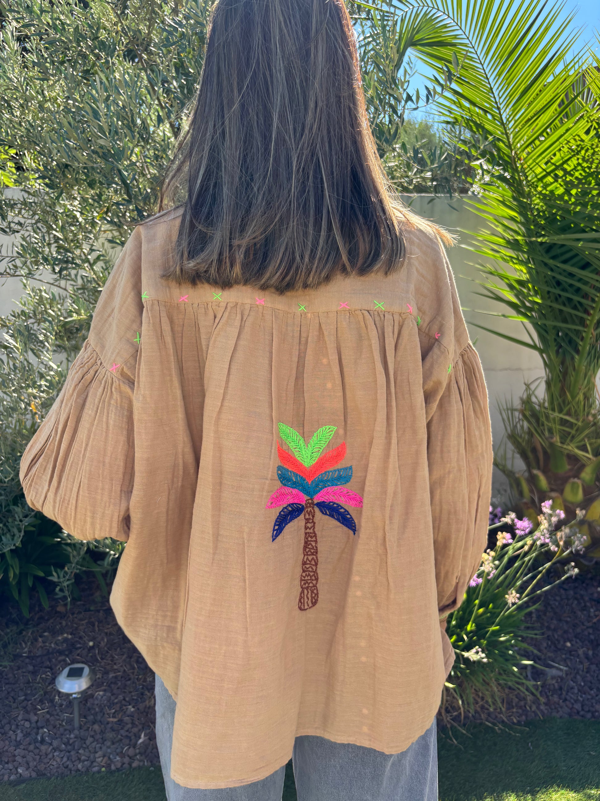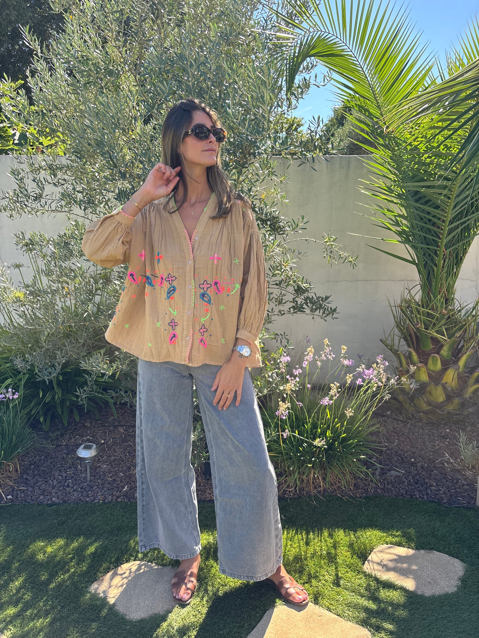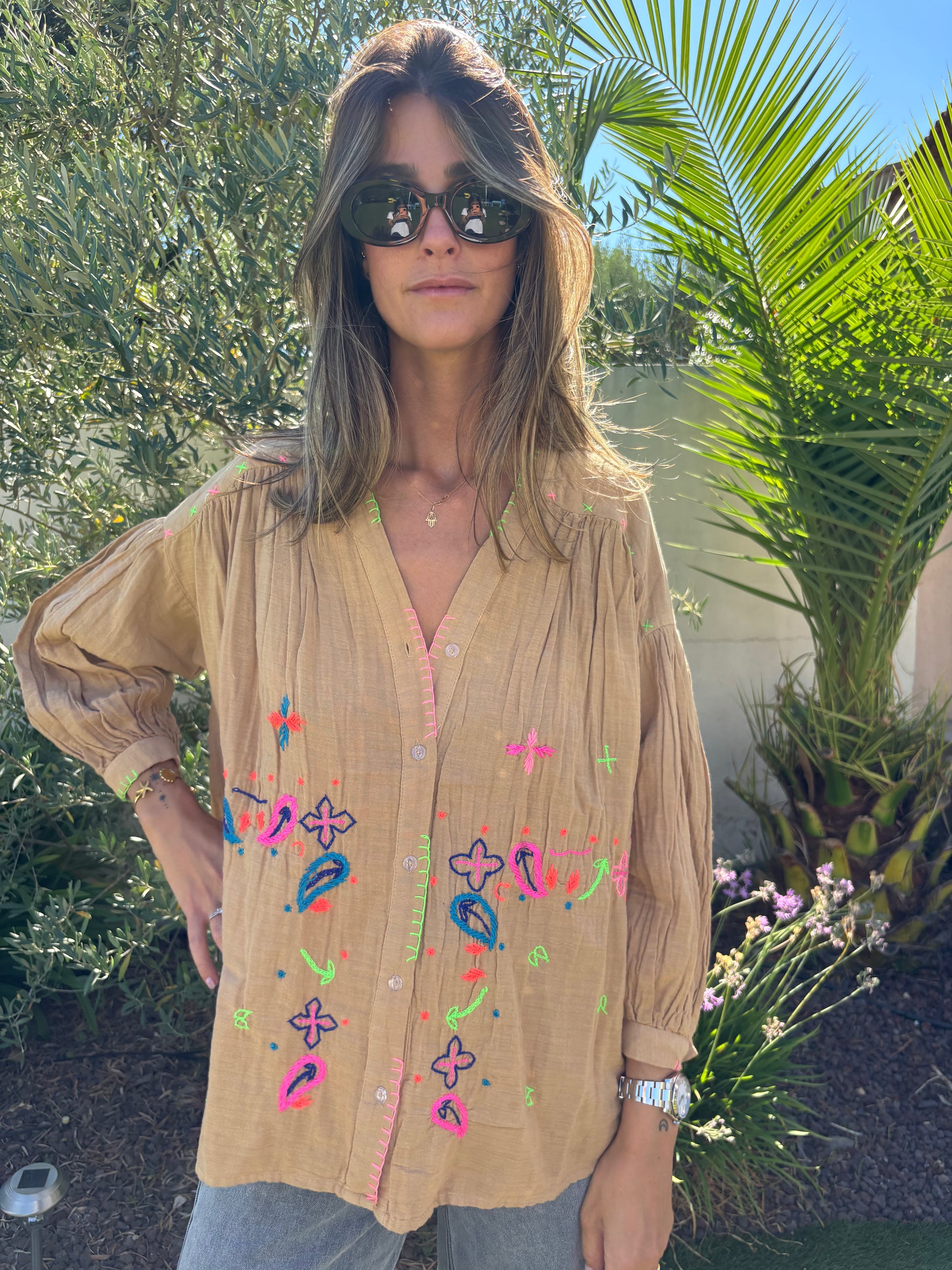 Craquez pour cette magnifique chemise oversize aux allures bohèmes ! Confectionnée dans un tissu camel doux et fluide, elle arbore de superbes broderies multicolores qui apportent une touche d'originalité et de fantaisie à votre garde-robe.