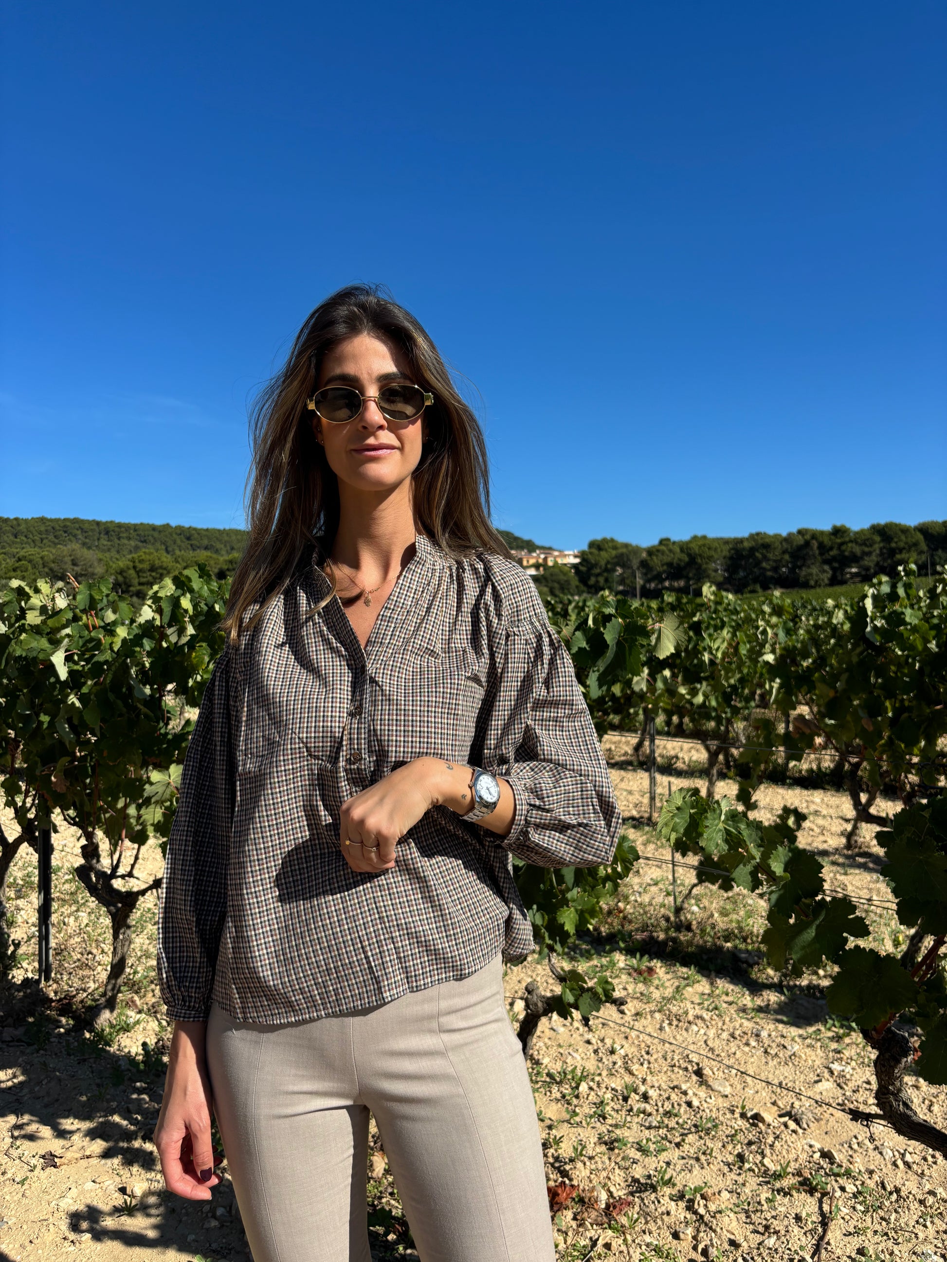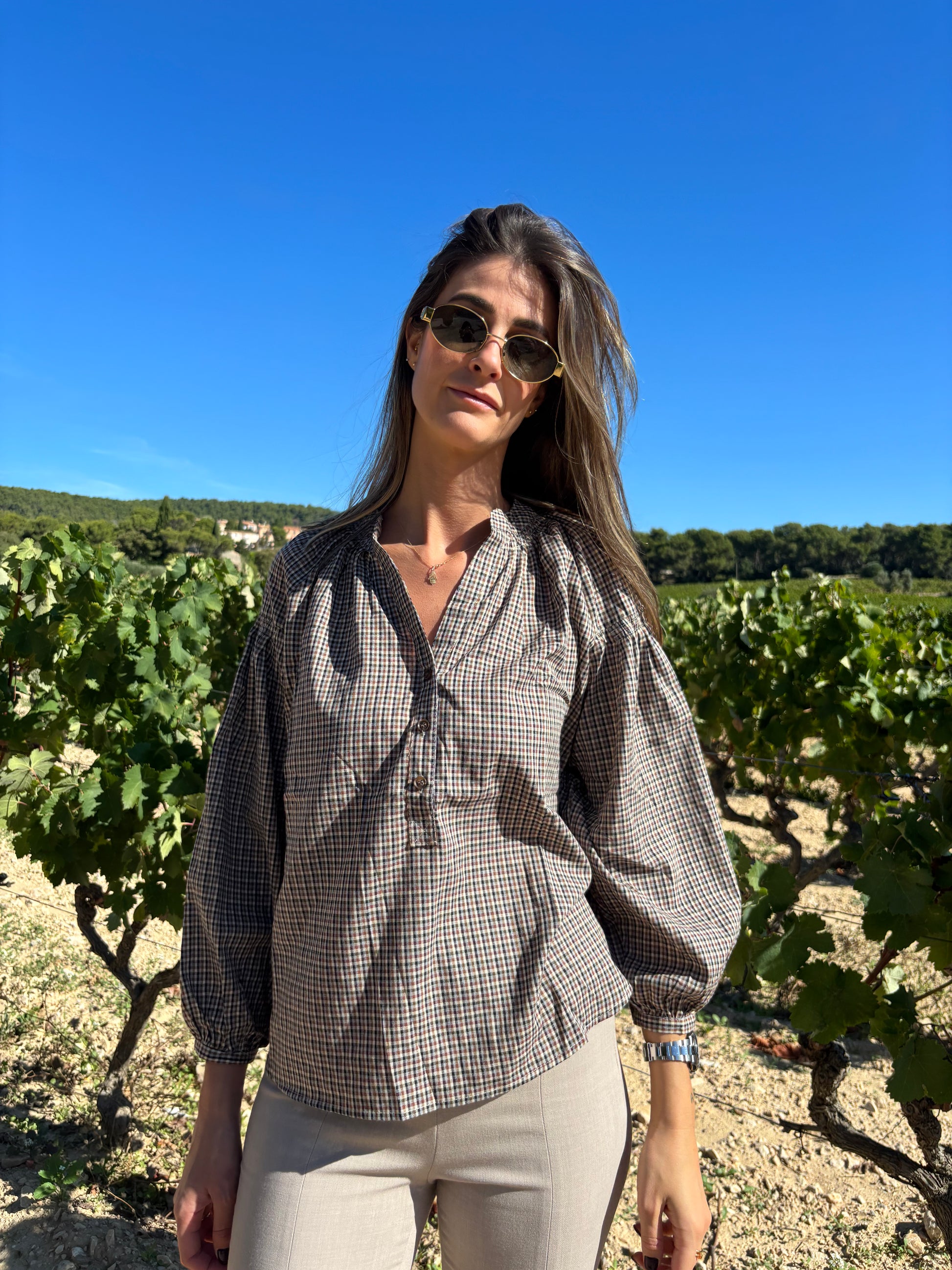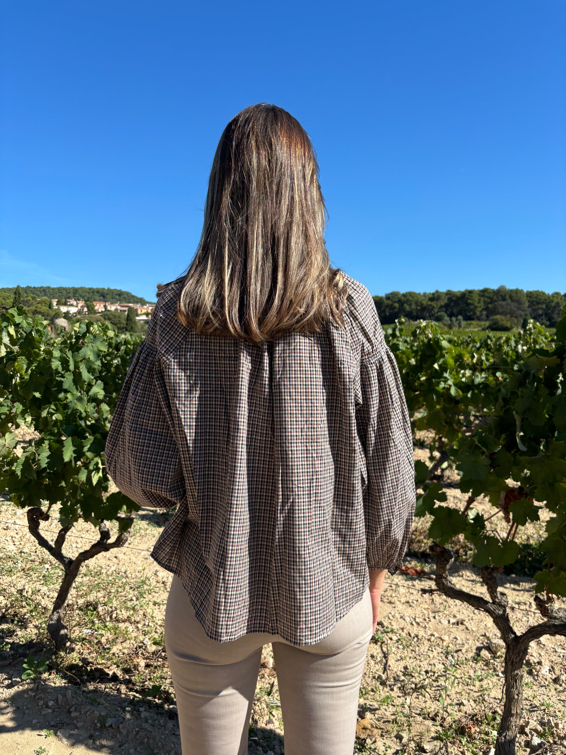 Ce chemisier élégant présente un motif vichy classique en petits carreaux noir et blanc qui apporte une touche chic et intemporelle à votre garde-robe.