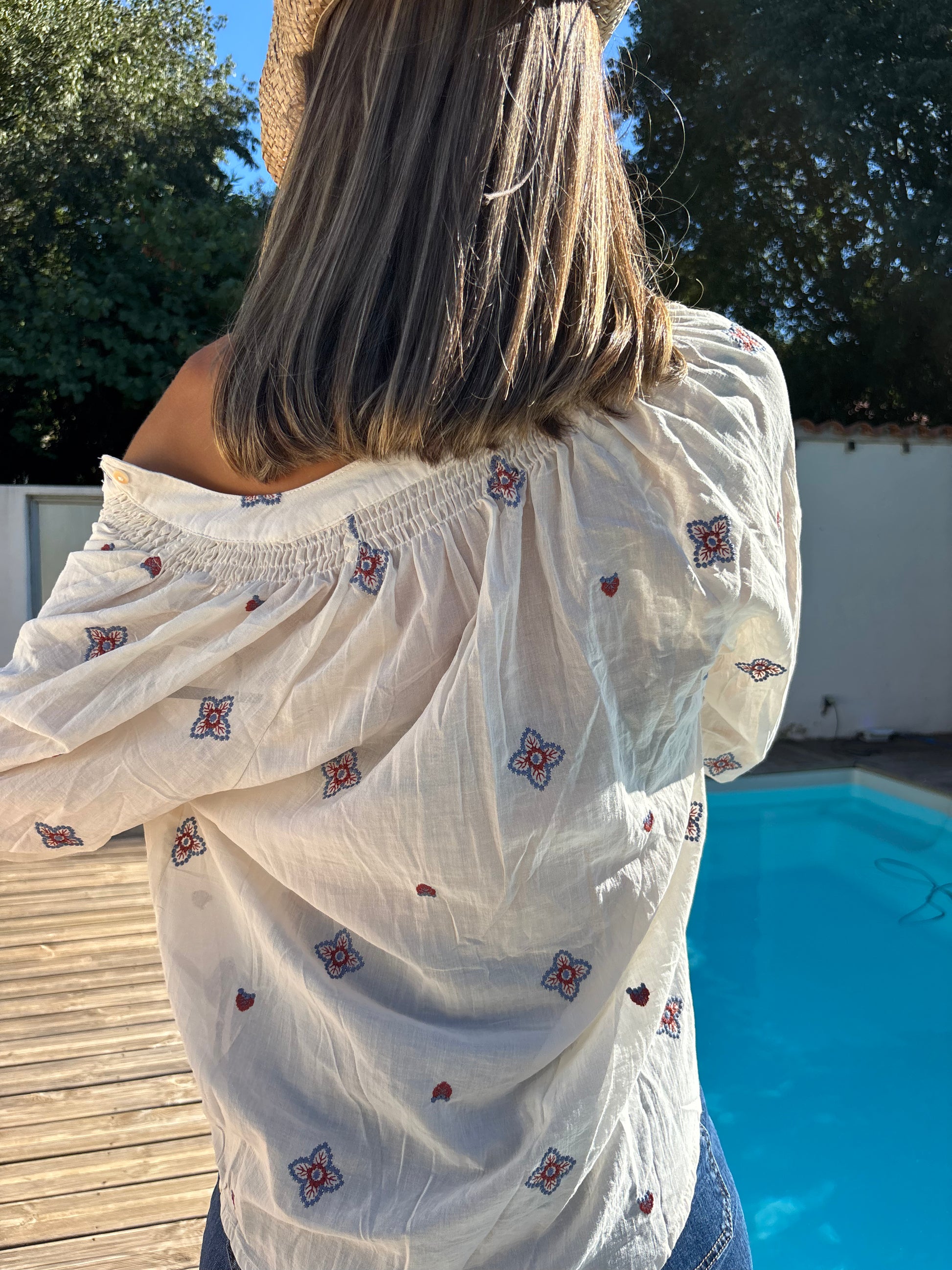 Laissez-vous séduire par ce ravissant chemisier en coton qui marie avec élégance motifs ethniques et confort moderne. Cette pièce incontournable de la garde-robe estivale vous accompagnera avec style.