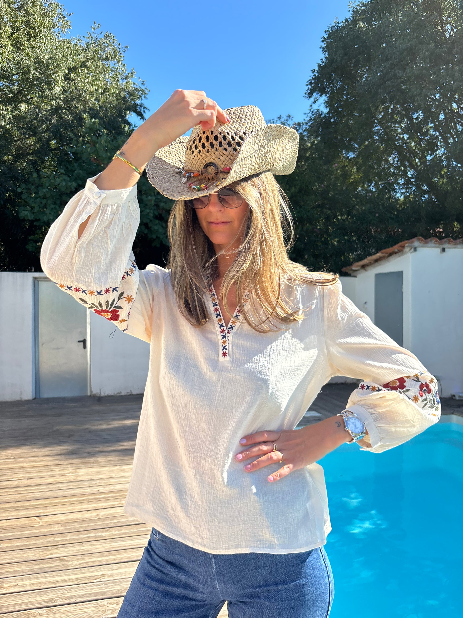 Succombez au charme de ce superbe chemisier en coton léger qui incarne parfaitement l'esprit bohème chic. Cette pièce coup de cœur se distingue par ses broderies délicates aux motifs floraux qui apportent une touche d'artisanat authentique.