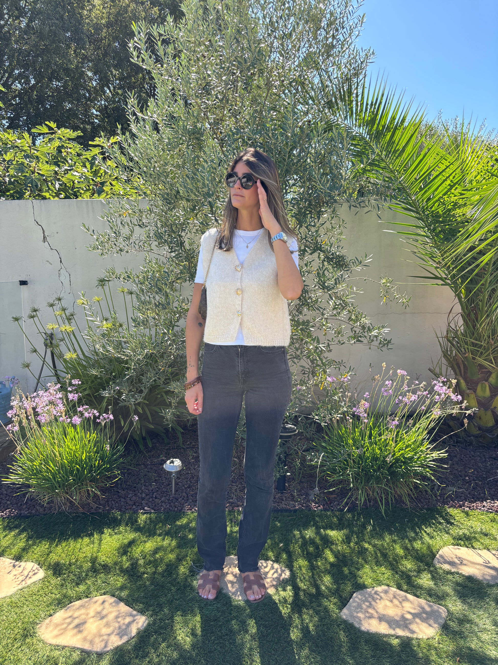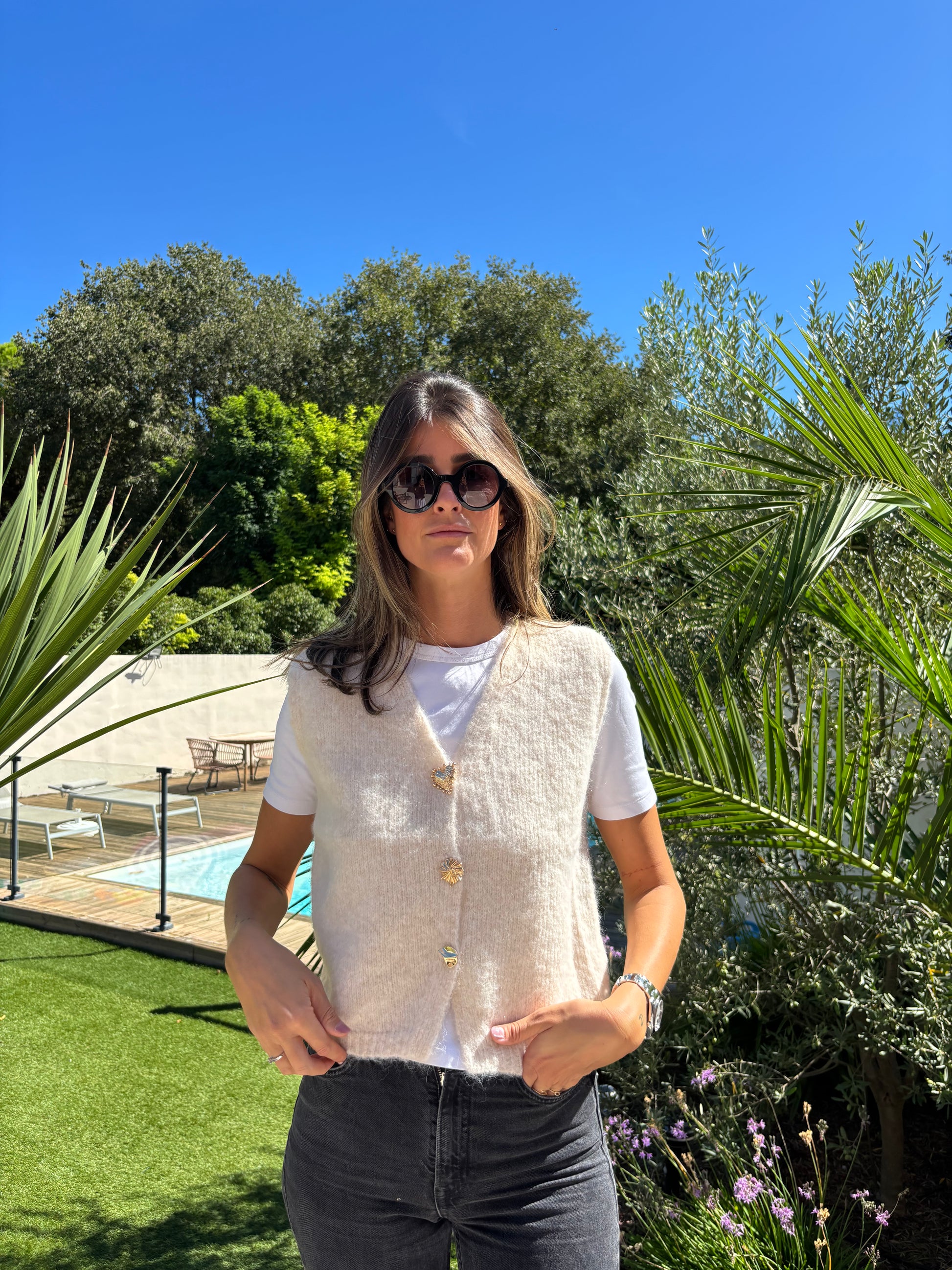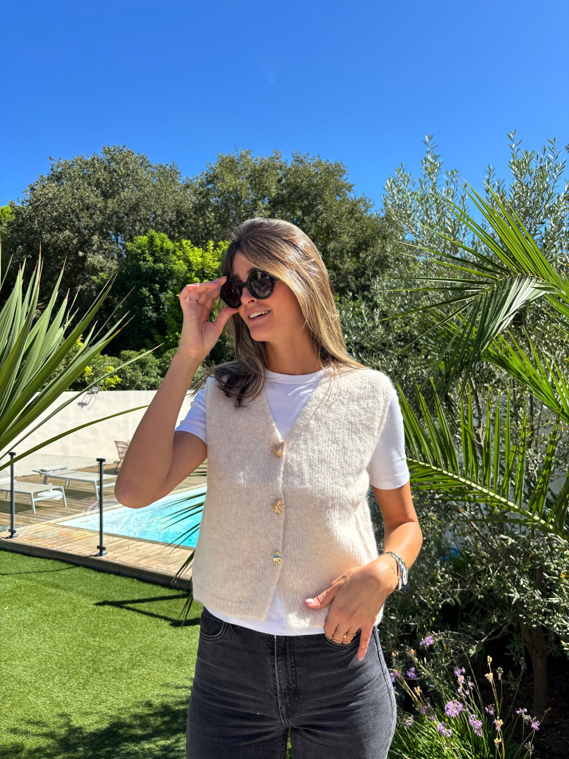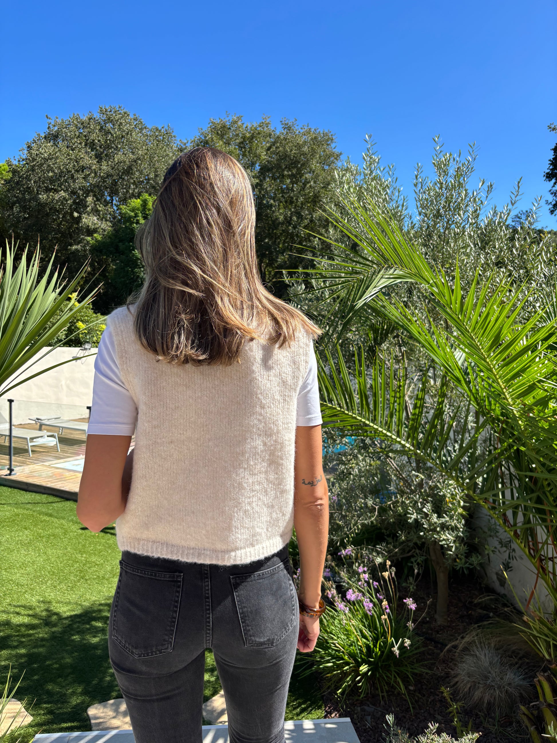 Craquez pour ce sublime gilet sans manches qui apportera une touche d'élégance raffinée à toutes vos tenues. Confectionné dans une maille fine et douce d'un beige chiné délicat, ce gilet se distingue par ses détails précieux qui en font une pièce unique.