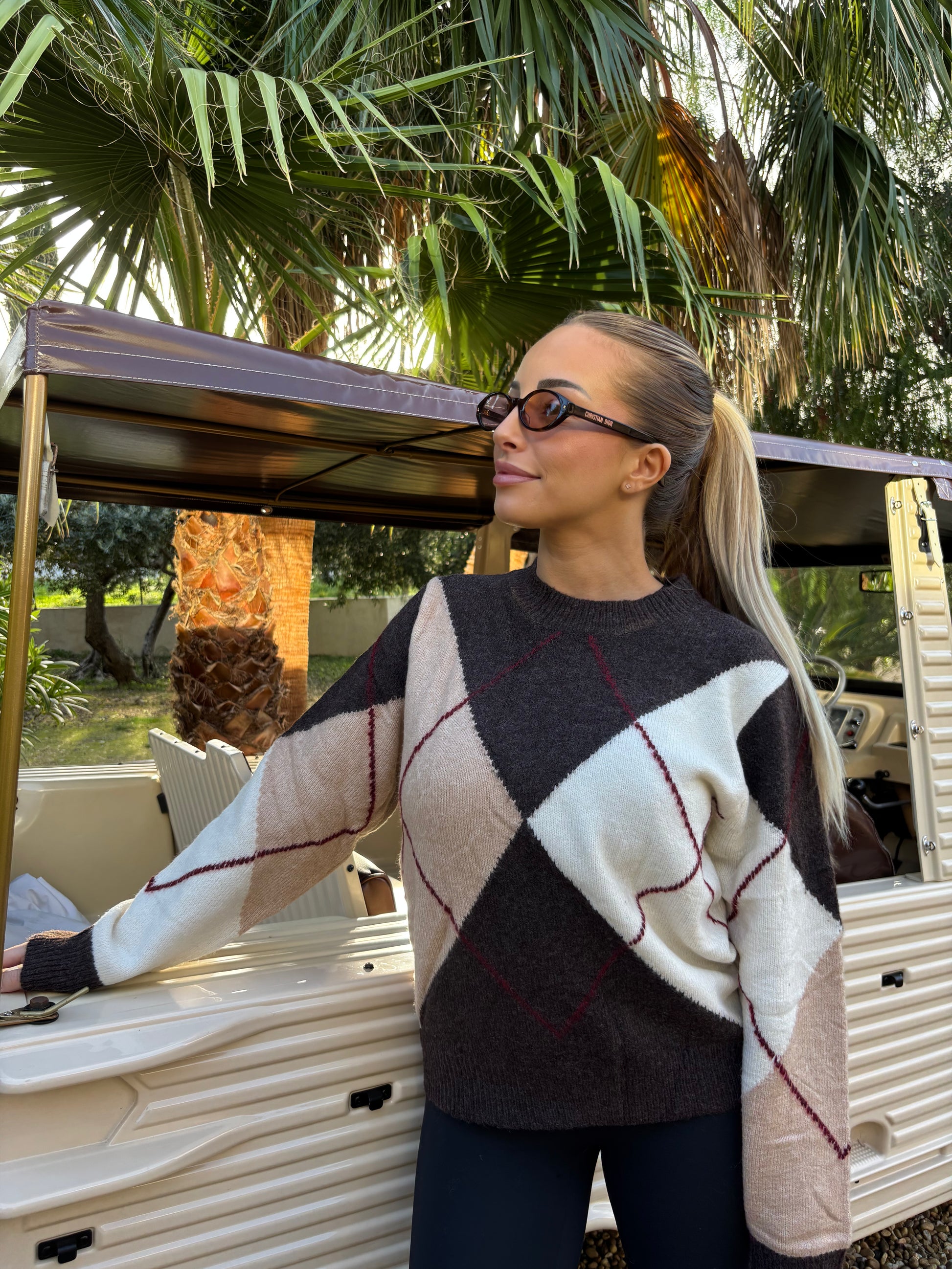 - Motifs : Argyle (losanges entrelacés) dans une composition graphique équilibrée avec des palettes de couleurs neutres : marron, blanc cassé, beige rosé et touches de bordeaux