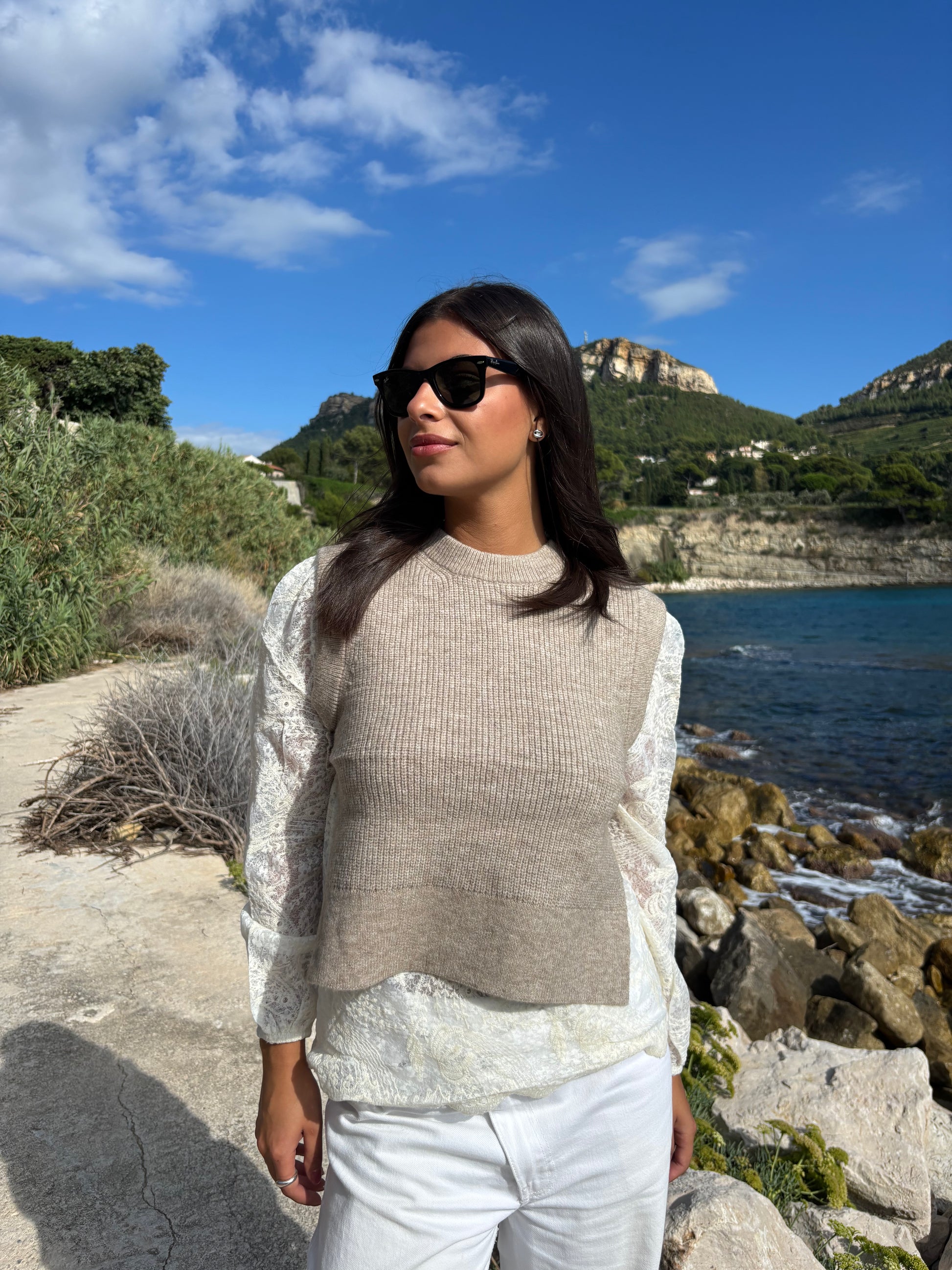 Finitions : Effet superposition avec un pull sans manches taupe et une chemise en dentelle blanche intégrée manches longues