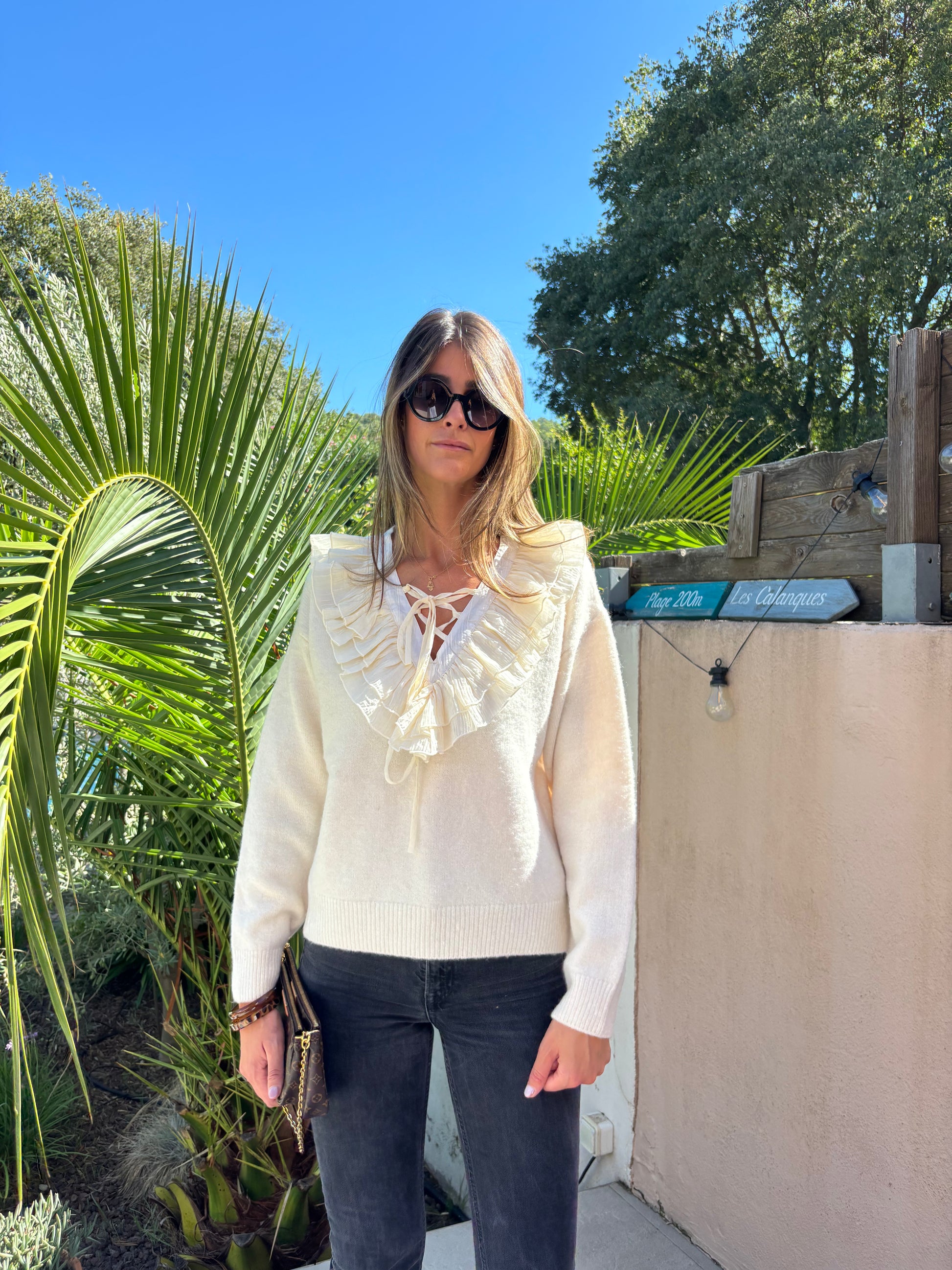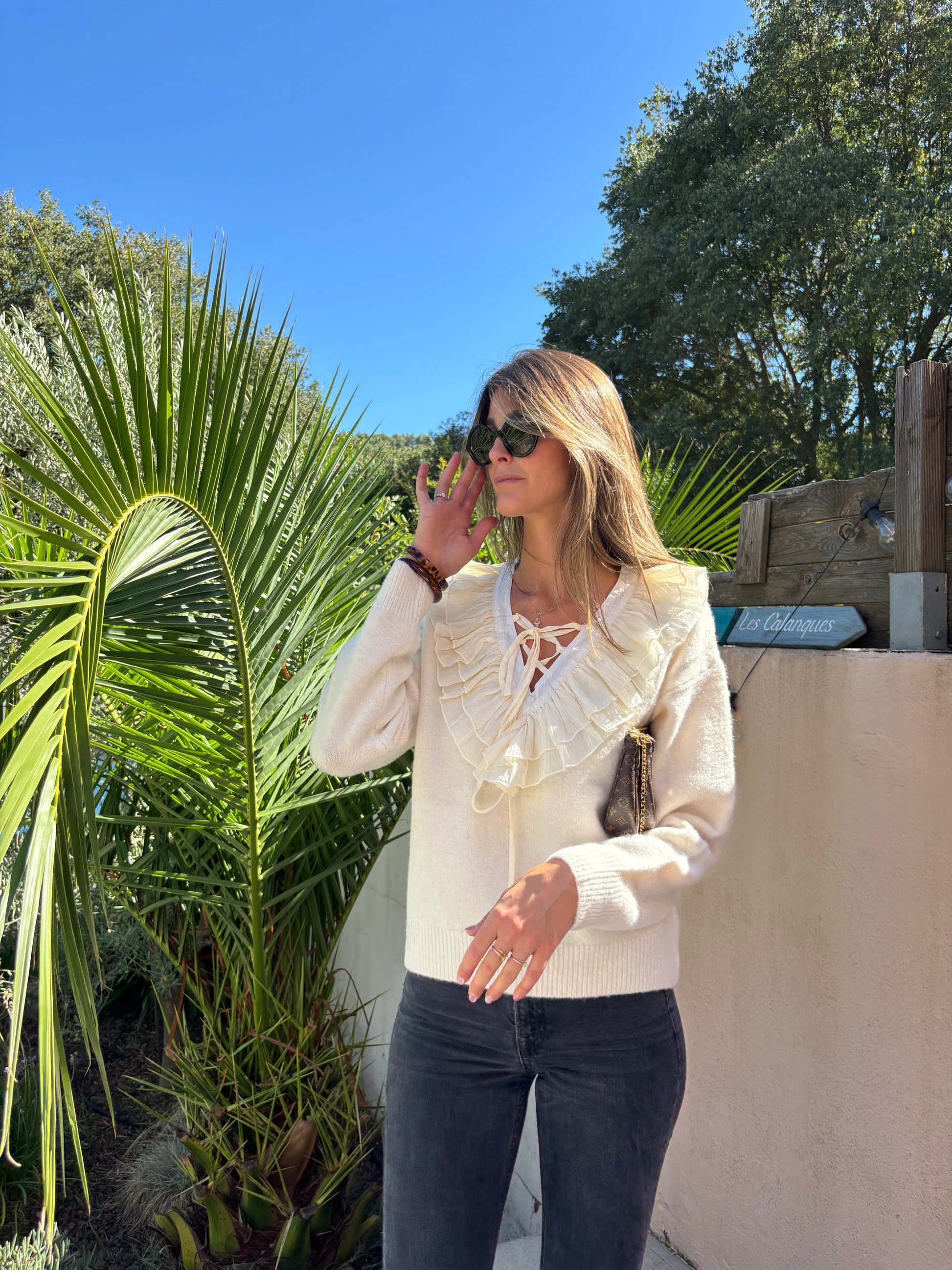 Craquez pour ce pull qui marie confort et féminité ! Avec son détail de laçage au décolleté, il apporte une touche bohème-chic à votre garde-robe.