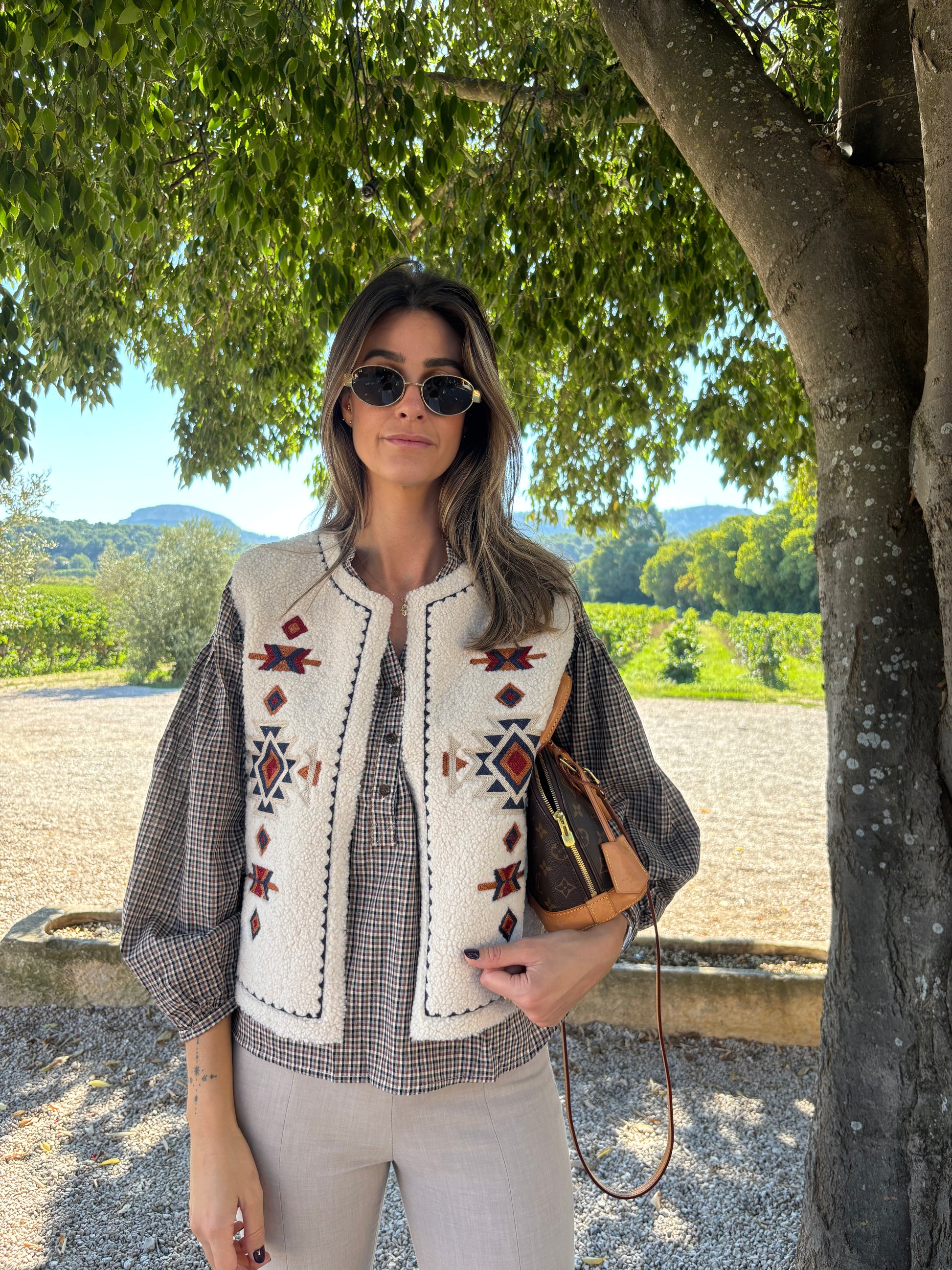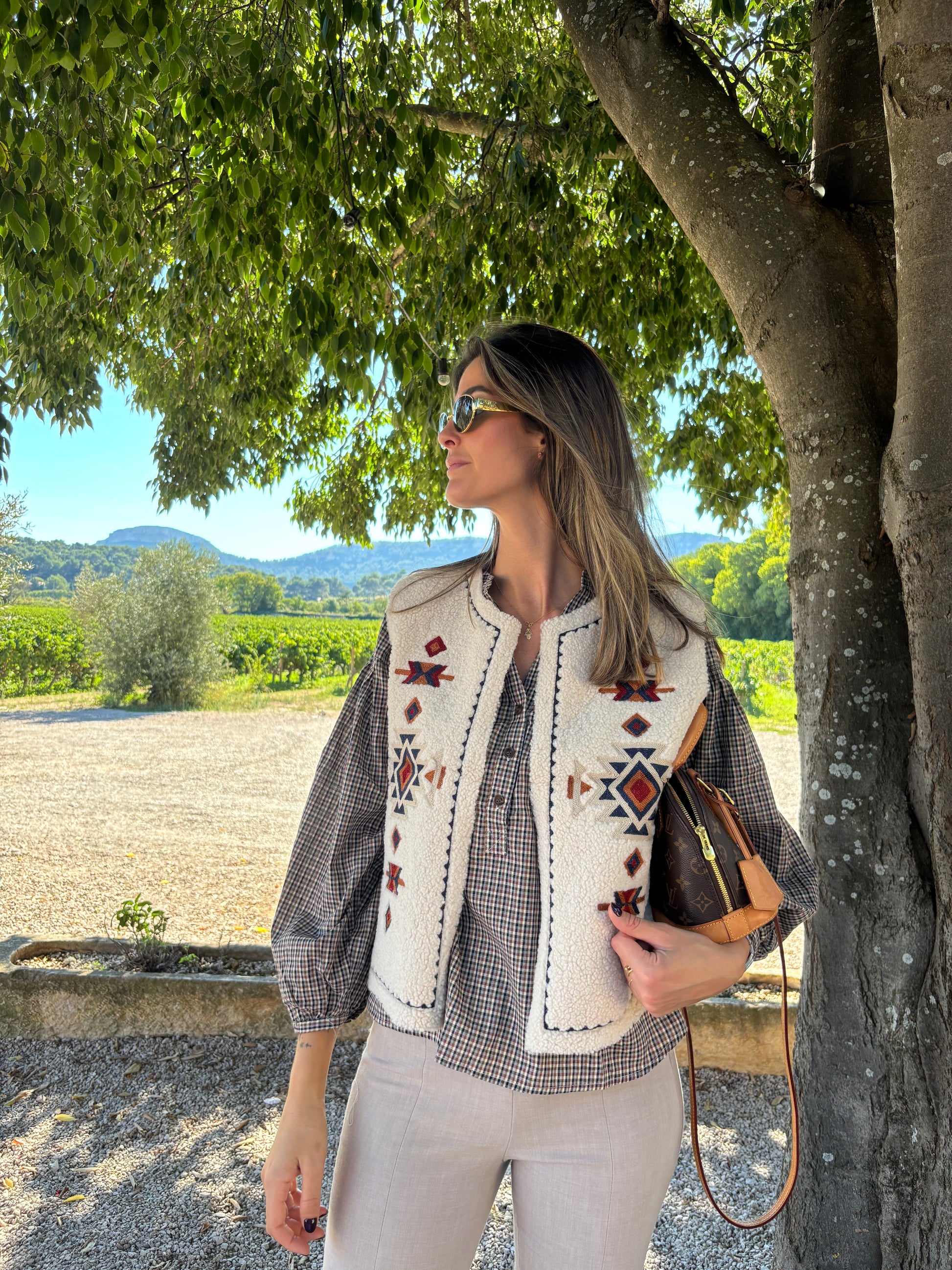 Cette magnifique veste sans manches allie tradition et modernité avec son style unique qui apporte une touche bohème sophistiquée à vos tenues.