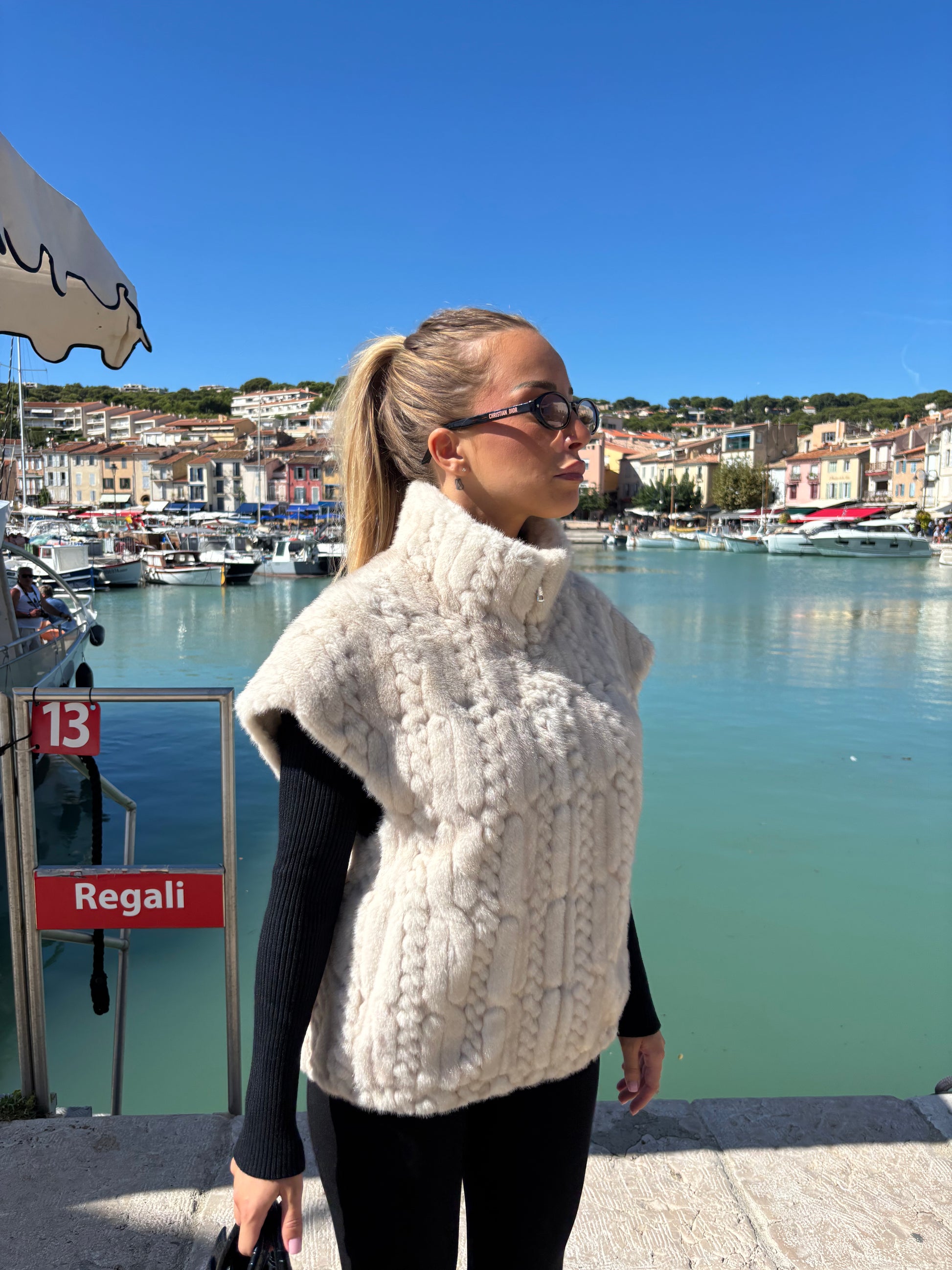 Enveloppez-vous de douceur avec ce somptueux gilet sans manches en maille torsadée. Cette pièce d'exception allie le charme authentique du tricot traditionnel à une coupe moderne ultra-tendance.